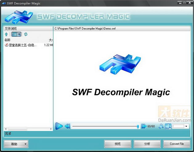 (*.SWF)經過反編譯,從而分解成原始的文本、圖片、聲音、圖形等元素,方便